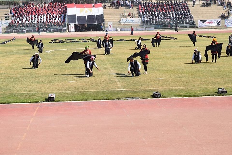 والجدير بالذكر أن الاحتفالية بدأت بإشعال شعلة الأسبوع , ثم طابور عرض الجامعات المشاركة فيه , وقدم حوالي 1200 طالب وطالبة من كلية التربية الرياضية أوبريت بعنوان : بإيدينا يامصر هنبنيكي , قدمت خلاله 11 لوحة فنية , وتضمن الأوبريت عرض المكونات الثقافية للشعب المصري من النوبة وحتي الإسكندرية , بجانب فقرة عن مشروع مصر الحضاري العملاق وهو قناة السويس الجديدة , كما شهد فقرة عن الجيش والشرطة ودورهم في حفظ أمن الوطن وتزامن هذا مع ظهور لوحة خلفية للرئيس عبد الفتاح السيسي , وقد أبدي الحضور والوفود انبهارهم بمستوي الأوبريت .