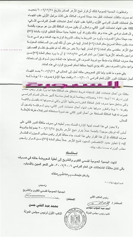 " السبورة " تنشر فتوي الجمعية العمومية لقسمى الفتوى والتشريع بمجلس الدولة للمعلمين والعاملين بالازهر بخصوص تقسيم مكافأة الامتحانات على الشهور الفتوى ان هذا ليس من السلطات المخولة لشيخ الازهر