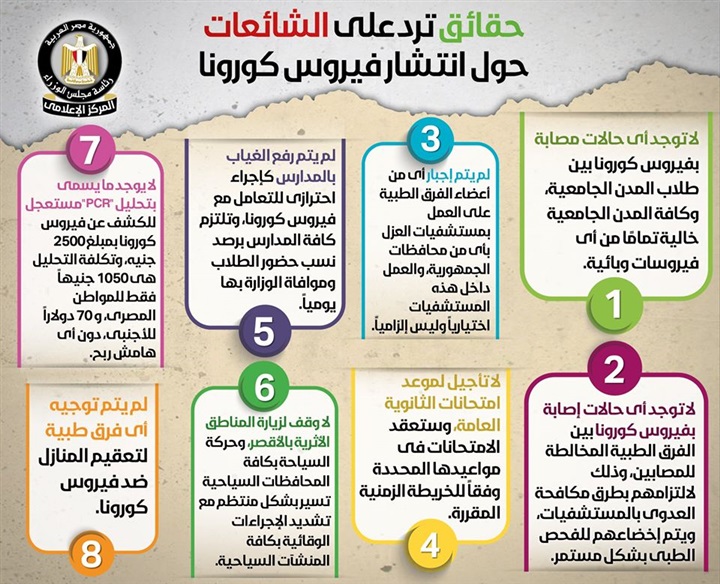 كشف المركز الإعلامى لمجلس الوزراء فى تقريره الدورى لرصد الشائعات عددا من الحقائق للرد على الشائعات المنتشرة بفيروس كورونا.
