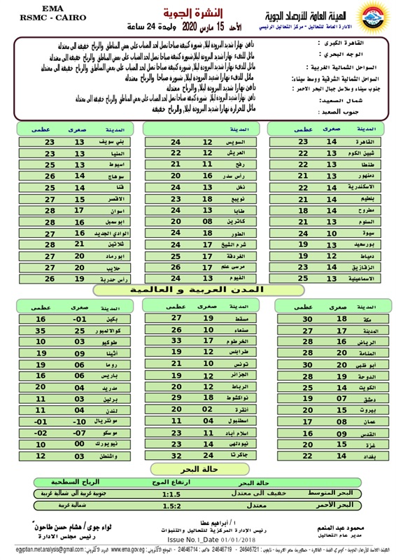 وأوضحت أن الطقس سيكون مائلا للدفء نهارا شديد البرودة ليلا على السواحل الشمالية الغربية و السواحل الشمالية الشرقية ووسط سيناء والوجه البحرى.