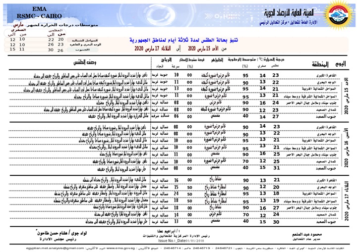 أعلنت الهيئة العامة للأرصاد الجوية تفاصيل حالة الطقس خلال الـ 72 ساعة القادمة، على مختلف أنحاء الجمهورية.