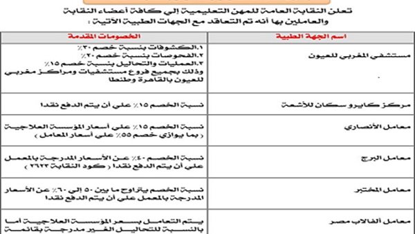 أكدت نقابة المهن التعليمية، اليوم الأحد، أنها قامت بالتعاقد مع عدد من المؤسسات الطبية لتقدم خدمات علاجية للعاملين بها بأسعار مخفضة.