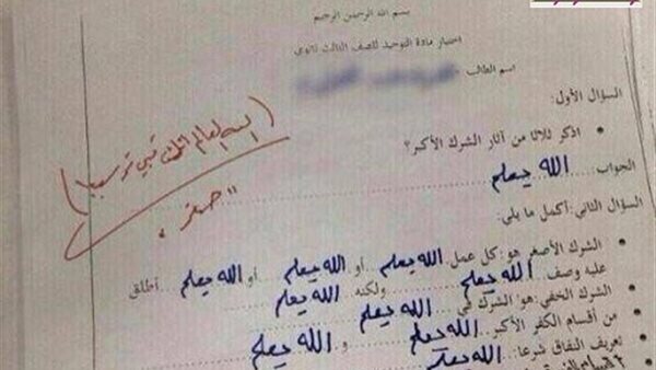 تداول رواد مواقع التواصل الاجتماعي صورة لورقة اجابة طالب بمادة التوحيد ، وكانت اجابته موحدة لجميع الاسئلة الله اعلم بينما كان رد المصحح موافقا لاجابة الطالب ايضا "الله يعلم انك تبى ترسب "
