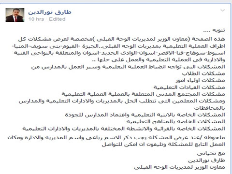 دشن طارق نور الدين معاون وزير التربية والتعليم صفحة عبر موقع التواصل الاجتماعي "فيس بوك " للتواصل مع المشكلات التى تواجه انضباط العملية التعليمية وسير العمل بالمدارس من مشكلات الطلاب و اولياءالأمور.