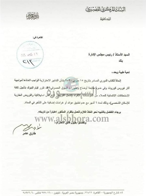 اصدر البنك المركزي تعليمات مهمة الى جميع البنوك بتأجيل كافة الأقساط على العملاء، من المؤسسات والأفراد، تشمل القروض الاستهلاكية والعقارية والإسكان الشخصي، لمدة 6 أشهر بدون غرامات تأخير.