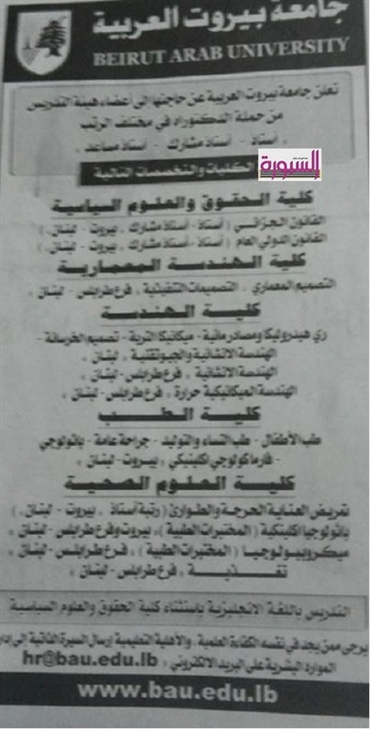اعلنت جامعة بيروت العربية Beirut Arab University عن حاجتها لاعضاء هيئة التدريس للعام الدراسي 2015 / 2016 من حملة الدكتوراه فى مختلف استاذ - استاذ مشارك - استاذ مساعد في كليات ، الحقوق والعلوم السياسية ، كلية الهندسة المعمارية ، كلية الهندسة ، كلية الطب ، كلية العلوم الصحية
