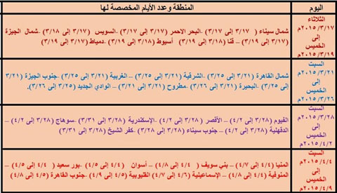 علي أن يكون يوم السبت 21 مارس المرحلة الثانية بمناطق شمال القاهرة والشرقية والغربية وجنوب الجيزة والبحيرة ومطروح والوادى الجديد وتنتهى يوم الخميس الموافق 23 مارس.