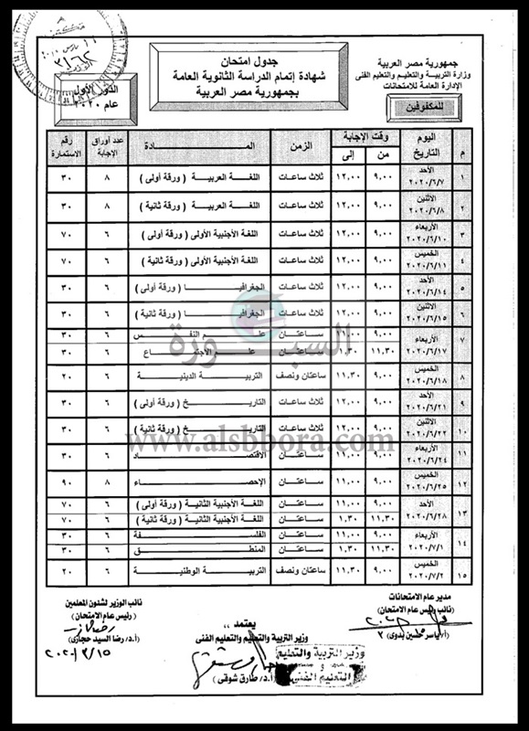 كما اعتمد الوزير أيضًا جدول امتحان شهادة إتمام الدراسة الثانوية العامة بمصر للمكفوفين (الدور الأول) للعام الدراسي الحالي، وتقرر أن تبدأ الامتحانات اعتبارًا من يوم 7 يونيو 2020 وتستمر حتى يوم 2 يوليو 2020.