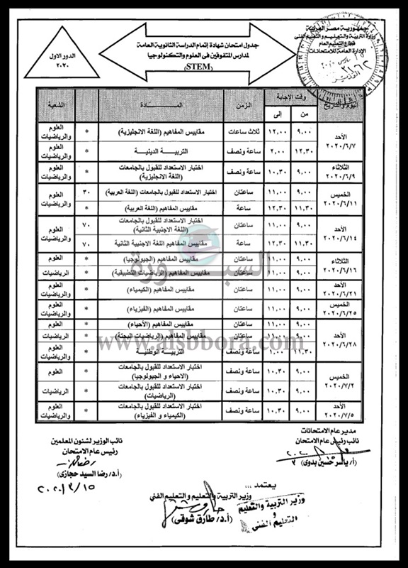 اعتمد الدكتور طارق شوقي، وزير التربية والتعليم والتعليم الفني، جدول امتحان شهادة إتمام الدراسة الثانوية العامة لمدارس المتفوقين في العلوم والتكنولوجيا (STEM) (الدور الأول) للعام الدراسي الحالي 2019- 2020.