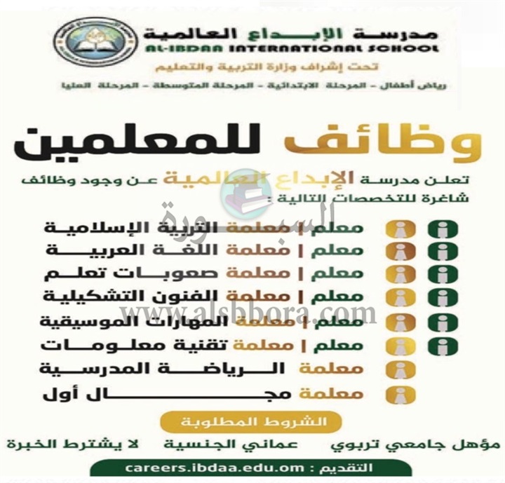 تعلن مدرسة الإبداع العمانية عن وظائف جديدة للمعلمين والمعلمات وذلك وفقا لنص الإعلان التالي:-