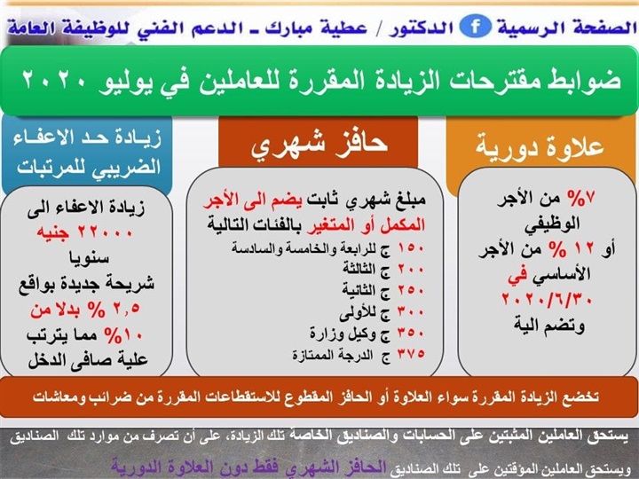 نشر الدكتور عطية مبارك على صفحته الرسمية الدعم الفنى للوظيفة العامة ضوابط مقترحات الزيادة المقررة للعاملين فى يوليو 2020، حيث تخضع الزيادة المقررة سواء العلاوة او الحافز المقطوع للاستقطاعات المقررة من ضرائب ومعاشات، ويستحق العام لين المثبتين على الحسابات والصناديق الخا صة تلك الزيادة على ان تصرف من موارد تلك الصناديق، ويستحق العاملون المؤقتون على تلك الصنادؤق الحافزى الشه رى فقط دون العلاوة الدورية.