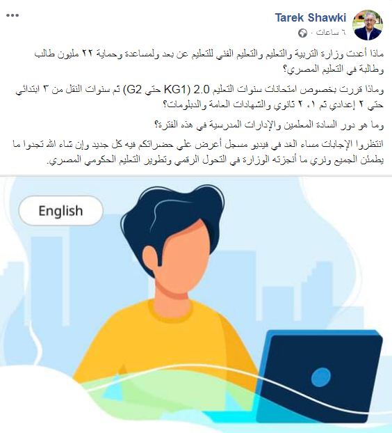 واضاف فى تصريحات له عبر صفحته الرسمية على موقع التواصل الاجتماعى فيسبوك، عن اعلانه ماذا أعدت وزارة التربية والتعليم والتعليم الفني للتعليم عن بعد ولمساعدة وحماية ٢٢ مليون طالب وطالبة في التعليم المصري؟