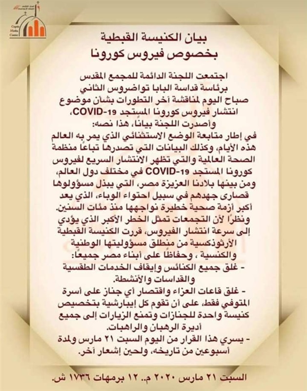 اصدر المجمع المقد قرارا بغلق جميع الكنائس وإيقاف الخدمات الطقسية والقداسات والأنشطة واقتصار الجنائز على أسرة المتوفى فقط لمواجهة «كورونا».