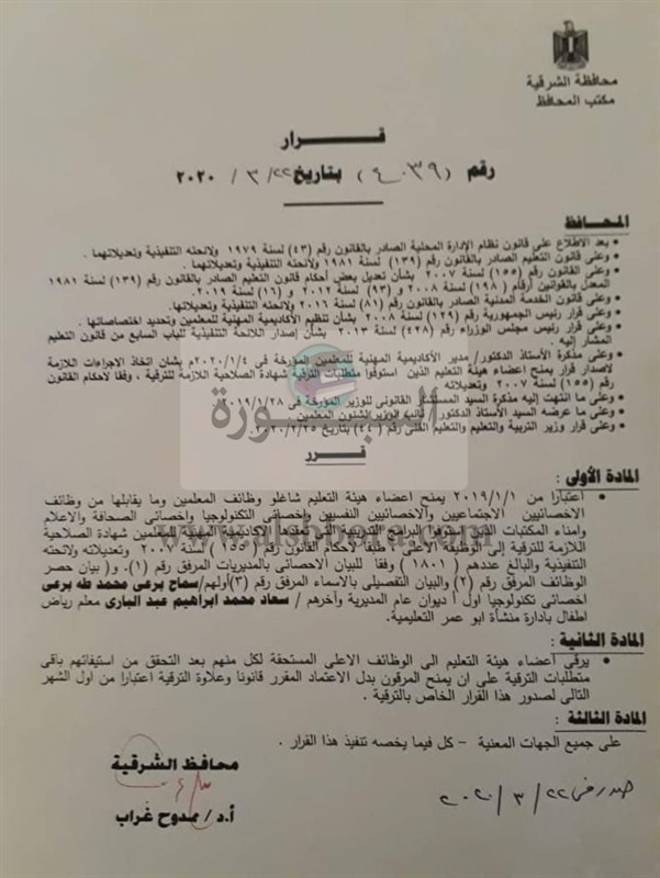 قام الدكتور ممدوح غراب محافظ الشرقية، اليوم الاحد 22 / 3 / 2020 باعتماد القرار رقم 4039 لسنة 2020 إعتبارًا من 1 / 1/ 2019.