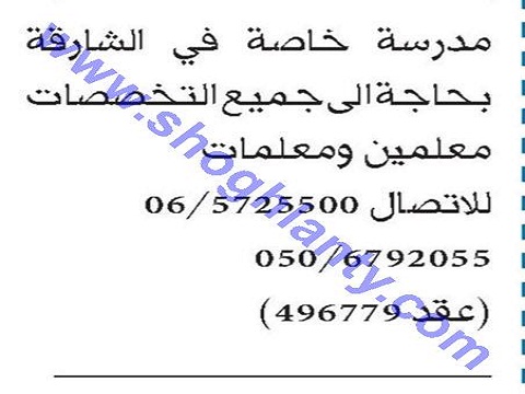 تعلن مدرسة خاصة في الشارقة عن حاجاتها إلي معلمين ومعلمات بجميع التخصصات.