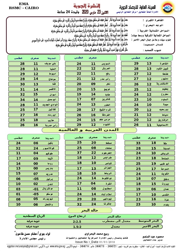 اعلن خبراء هيئة الأرصاد ،عن حدوث تغيرات جوية بطقس اليوم الاثنين، حيث يشهد ارتفاع ملحوظ بحرارة الجو يصل 8 درجات عن اليوم الأحد ، حيث يتوقع بالقاهرة الكبرى طقس معتدل نهارا شديد البرودة ليلا، وأمطار خفيفة على مناطق متفرقة والرياح مثيرة للرمال والأتربة على مناطق متفرقة ، ويشهد الوجه البحرى أيضا طقس معتدل نهارا شديد البرودة ليلا، وأمطار خفيفة على مناطق متفرقة والرياح مثيرة للرمال والأتربة على مناطق متفرقة ، وعلى السواحل الشمالية الغربية، طقس معتدل نهارا شديد البرودة ليلا، وأمطار خفيفة على مناطق متفرقة والرياح مثيرة للرمال والأتربة على مناطق متفرقة.