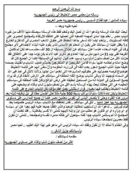 ننشر.. نص رسالة معلمي الـ" 30 الف معلم" الاحتياطي لـ "السيسي"