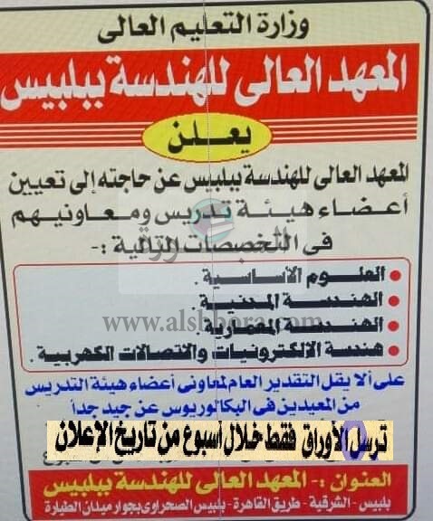 يعلن المعهد العالى للهندسة ببلبيس عن حاجته الى اعضاء هيئة التدريس ومعاونيهم من المعيد الى الاستاذ، وعلى الراغبين فى الحصول على الوظيفة ارسال السيرة الذاتية عبر الايميل المنشور فى جريدة المساء اليوم الاثنين الموافق 23 مارس 2020، خلال اسبوع من تاريخ النشر.