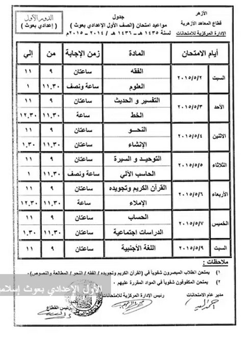 ننشر.. جدول امتحانات الإعدادية الأزهريه ( الصف الاول والثانى الإعدادي) 2015 الترم الثانى