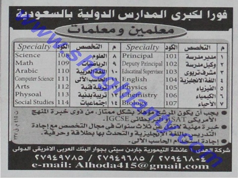 تعلن كبر المدارس الدولية بالسعودية عن حاجتها لمعلمين ومعلمات في التخصصات الاتية:-
