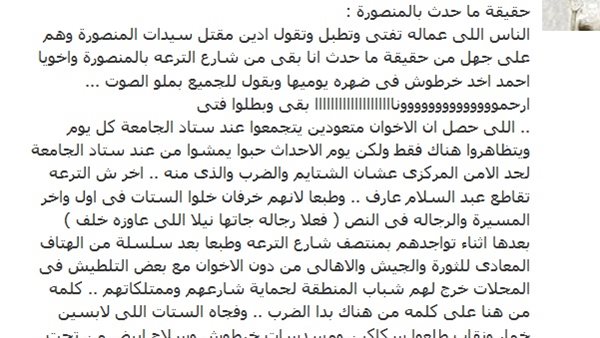 الناس اللى عماله تفتى وتطبل وتقول ادين مقتل سيدات المنصورة وهم على جهل من حقيقة ما حدث انا بقى من شارع الترعه بالمنصورة واخويا احمد اخد خرطوش فى ضهره يوميها وبقول للجميع بملو الصوت ... ارحمووووووووووووووناااااااااااااااااااا بقى وبطلوا فتى