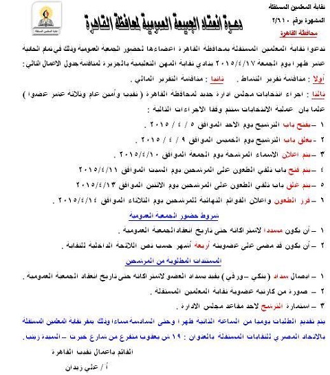 تعقد نقابة المعلمين المستقلة بمحافظة القاهرة الجمعية العمومية يوم الجمعة 17/4/2015 بنادي نقابة المهن التعليمية بالجزيرة لمناقشة جدول الاعمال التالي:
