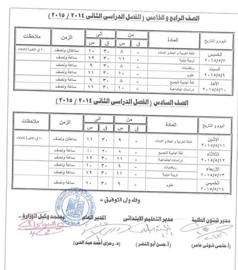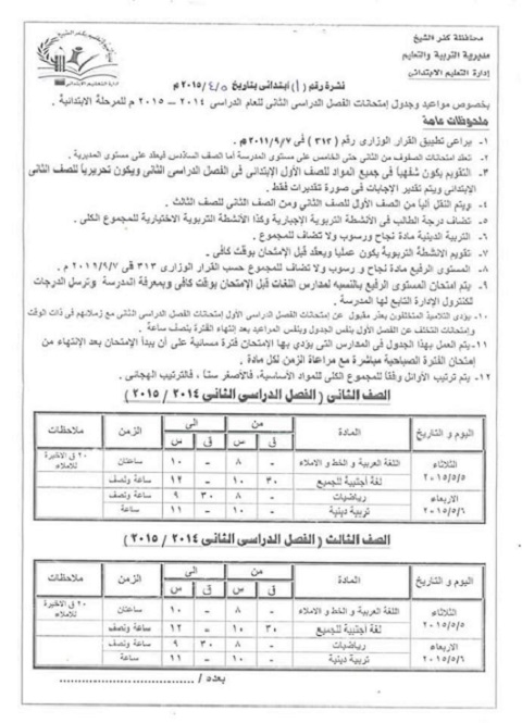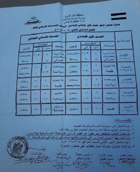 ننشر ..جدول أمتحانات الفصل الدراسي الثاني لابتدائي واعدادي كفر الشيخ