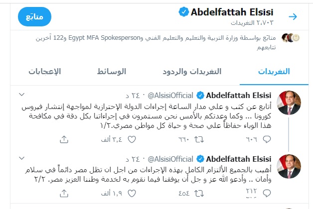 وقال عبر صفحته الرسمية على موقع التواصل الاجتماعى "تويتر": "أتابع عن كثب و علي مدار الساعة إجراءات الدولة الاحترازية لمواجهة انتشار فيروس كورونا... وكما وعدتكم بالأمس نحن مستمرون في إجراءاتنا بكل دقة في مكافحة هذا الوباء حفاظًا على صحة وحياة كل مواطن مصري".
