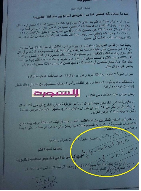 جاء ذلك بناء علي المذكرة التي قدمها قدامي الخريجين التربويين من ابناء المحافظة والذين تظلموا فيها من تسكين التسكين بعض المتقدمين من محافظات اخري بمحافظة القليوبية ، وارسل المذكرة ايضا لمديرية التربية والتعليم بالمحافظة ، كما طالب بحصر الدرجات الخالية