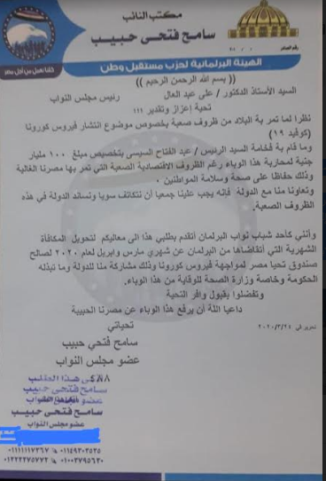 أعلن سامح فتحي حبيب، عضو مجلس النواب عن محافظة الغربيه أنه تقدم بطلب إلى الدكتور على عبد العال، رئيس مجلس النواب من خلال الامين العام للمجلس يتضمن طلب تحويل المكافئة الشهرية التي يتقاضها من البرلمان عن شهري مارس و أبريل إلى صندوق تحيا مصر، وذلك للمساهمة مع الدولة في محاربة فيروس كورونا ، وناشد حبيب رجال الأعمال ونواب البرلمان والفنانين والإعلامين ولاعبين كرة القدم وذلك من أجل الوقوف بجوار الدولة ومشاركتهم في هذه الظروف الصعبة التي تمر بها البلاد