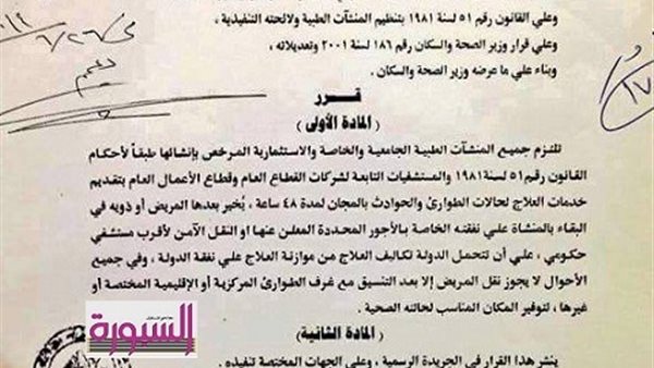 تلتزم جميع المنشآت الطبية الجامعية والخاصــة والاســتثمارية المرخــص بإنشائهــا طبقًا لأحكام القانون رقم 51 لسنة 1981 والمستشفيات التابعة لشركات القطاع العام وقطاع الأعمال العام بتقديم خدمات العــلاج لحــــالات الطــــوارئ والحــــوادث بالمجـــــان لمدة 48 ساعة ،