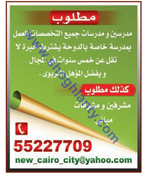 تعلن دولة قطر عن حاجتها إلي مدرسين ومدرسات جميع التخصصات للعمل بمدرسة خاصة بالدوحة يشترط خبر لا تقل عن خمس سنوات في المجال ويفضل المؤهل التربوي إلي جانب الحاجة لمشرفين ومشرفات.