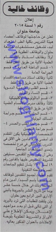 تعلن جامعة حلوان عن حاجتها لوظائف باعضاء هيئة التدريس بكلية الطب استعدادا لبدء تشغيل مستشفيات الجامعة.