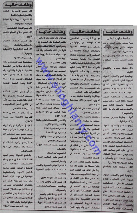 تعلن جامعة جنوب الوادي عن حاجتها لششغل بعض الوظائف وذلك علي النحو التالي: