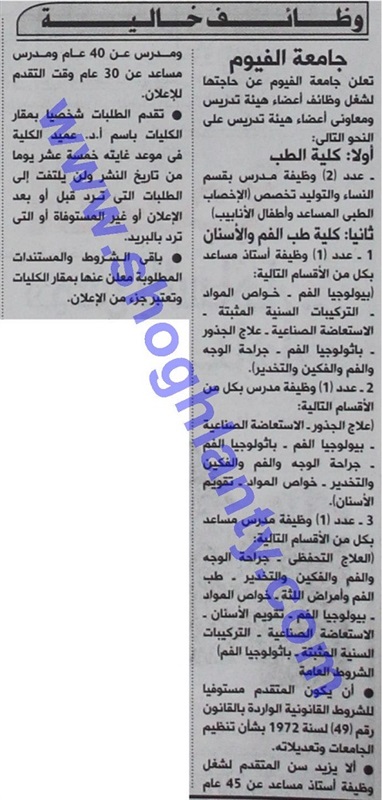 تعلن جامعة الفيوم عن حاجتها لشغل وظائف اعضاء هيئة تدريس ومعاوني اعضاء هيئة تدريس علي النحو التالي: