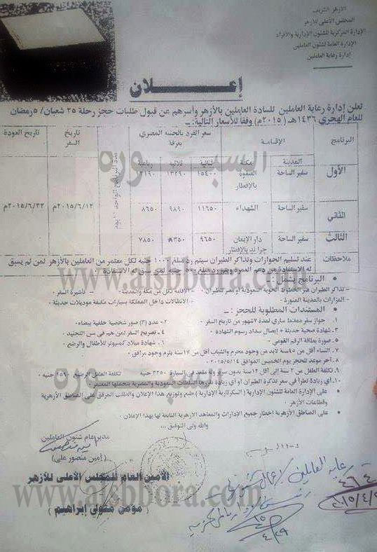 أعلنت إدارة رعاية العاملين بالأزهر الشريف عن قبول طلبات حجز رحلة عمرة 25 شعبان، و5 رمضان للعام الهجرى 1436 هـ، ووفقا للأسعار والشروط الموضحة بالإعلان.