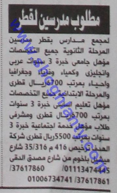 يعلن مجمع مدارس بقطر عن حاجتة الي مدرسين في المرحلة الثانوية في جميع التخصصات مؤهل جامعي خبرة 3 سنوات عربي وانجليزي وكمياء وفيزياء وجغرافيا واحياء بمرتب 6700 ريال قطري والمرحلة الابتدائية جميع التخصصات مؤهل تعليم اساسي خبرة 3 سنوات بمرتب 6700 ريال قطري ومشرفي طلاب مؤهل خدمة اجتماعية خبرة 3 سنوات بمرتب 5500 ريال قطري.