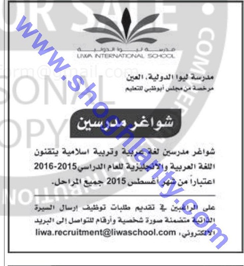 تعلن مدرسة ليوا الدولية، العين "مرخصة من مجلس أبوظبي للتعليم عن حاجتها الي مدرسين لغة عربية وتربية اسلامية يتقنون اللغة العربية والانجليزية للعام الدراسي 2015 – 2016 اعتبارا من شهر اغسطس 2015 جميع المراحل.