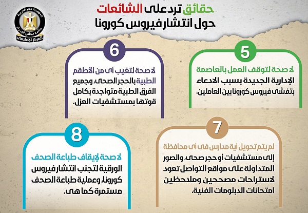 وأوضح انه لا صحة لتوقف العمل بالعاصمة الإدارية الجديدة بسبب الادعاء بتفشي فيروس كورونا بين العاملين وانه لم يتم تحويل أية مدارس في أي محافظة إلى مستشفيات أو حجر صحي، والصور المتداولة على مواقع التواصل تعود لاستراحات مصححين وملاحظين امتحانات الدبلومات الفنية وانه لا صحة لتغيب أي من الأطقم الطبية بالحجر الصحي، وجميع الفرق الطبية متواجدة بكامل قوتها بمستشفيات العزل وانه لا صحة لإيقاف طباعة الصحف الورقية لتجنب انتشار فيروس كورونا، وعملية طباعة الصحف مستمرة كما هي.