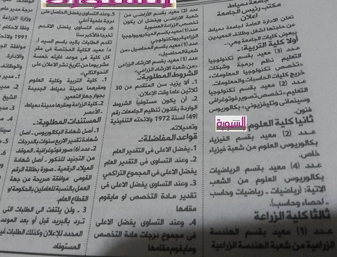 اعلنت جامعة دمياط حاجتها لشغل وظائف لاعضاء هئية التدريس بثلاث كليات " التربية والعلوم والزراعة .. ننشر الشروط والتخصصات المطلوبة