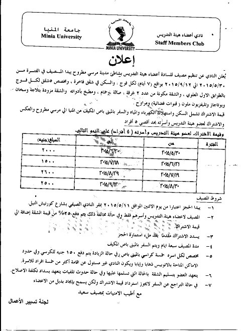يعلن نادي أعضاء هيئة التدريس بجامعة المنيا عن تنظيم بشاطئ مدينة مرسي مطروح يبدا المصيف في الفترة من 30/5/2015 إلي 12/9/2015 بواقع (7 أيام) لكل فوج والسكن في شقة فاخرة .