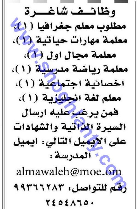 وعلي من يرغب في الالتحاق بالعمل إرسال السيرة الذاتية والشهادات علي الايميل التالي: [email protected] - والاتصال علي هاتف : 99366283 - عمان