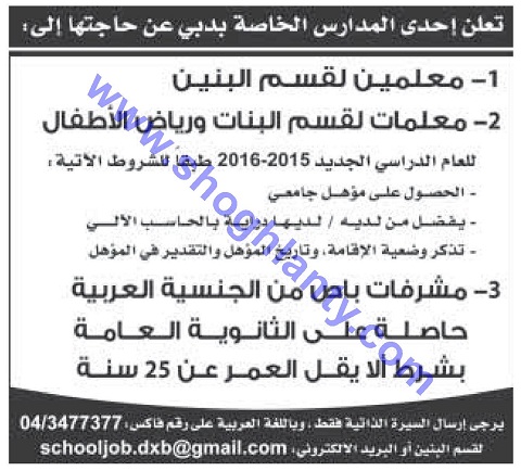 تعلن إحدي المدارس الخاصة بدبي عن حاجتها إلي :-
