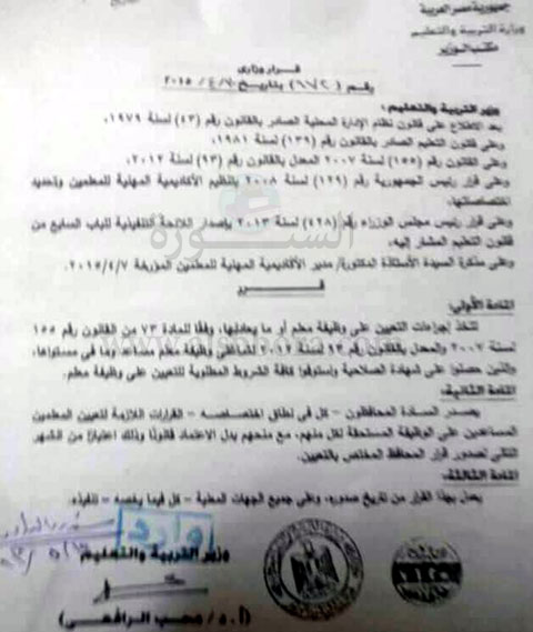 أصد الدكتور محب الرافعي وزير التربية والتعليم قرارا بتعيين 14719 معلم مساعد بوظيفة معلم و"السبورة" تنفرد بنص القرار672: