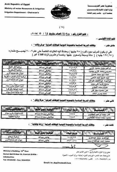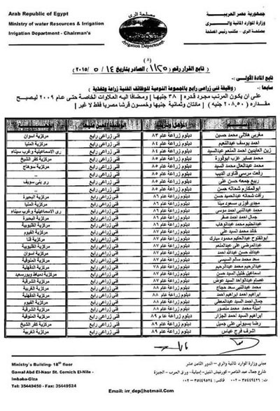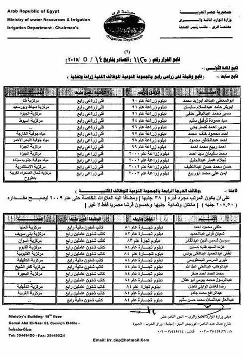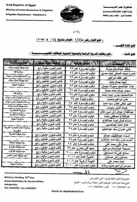 قررت لجنة شؤن العملين الفرعية بديوان عام مصلحة الري علي تعيين المتقدمين للمسابقة للعمل بديوان عام مصلحة الراي بالوظائف والدرجات المجموعات النوعية
