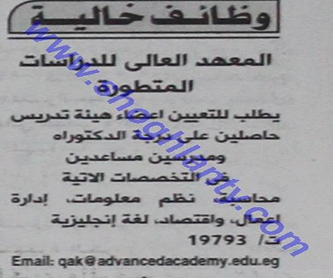 يعلن المعهد العالي للدرسات المتطورة عن حاجته لاعضاء هيئة تدريس حاصلين علي درجة الدكتوراه ومدرسين مساعدين في التخصصات الاتية :