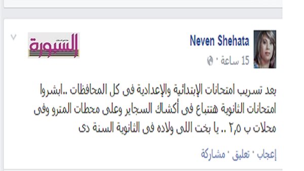 قالت نيفين شحاته المستشارالاعلامي السابق لوزير التربية والتعليم محب الرافعي ومحرر شئون التعليم بجريدة الاهرام ، عبر صفحتها الشخصية علي موقع التواصل الاجتماعي " الفيس بوك " بعد تسريب امتحانات الإبتدائية والإعدادية فى كل المحافظات ..ابشروا امتحانات الثانوية هتتباع فى أكشاك السجاير وعلى محطات المترو وفى محلات ب ٢,٥ .. يا بخت اللى ولاده فى الثانوية السنة دى