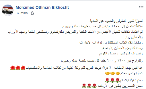 قال الدكتور محمد عثمان الخشت رئيس جامعة القاهرة، على صفحته الرسمية على موقع التواصل الاجتماعي فيسبوك، إنه اعتمد مكافآت تتراوح من 600 جنيه إلى 1200 جنيه، وتصرف قبل شهر رمضان، نظير الجهود غير العادية للموظفين بالجامعة وكلياتها، والدور البطولي للأطقم الطبية والتمريض بمستشفى قصر العيني الفرنساوي ومستشفى الطلبة والمعهد القومي للأورام، وكل الإدارات المستثناة من قرارات الإجازة في الفترة الماضية، وذلك حسب طبيعة عمل وجهود كل منهم.