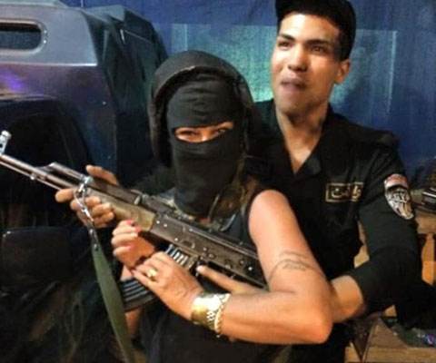 ويظهر في الصور مجموعه من جنود الأمن المركزي مبتسمين وهم ينتظرون دورهم في احتضان السائحة الجميلة والتقاط الصور معها.