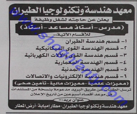 يعلن معهد هندسة وتكنولوجيا الطيران عن حاجته لشغل وظيفة (مدرس – أستاذ مساعد – أستاذ ) للأقسام الآتية:-
